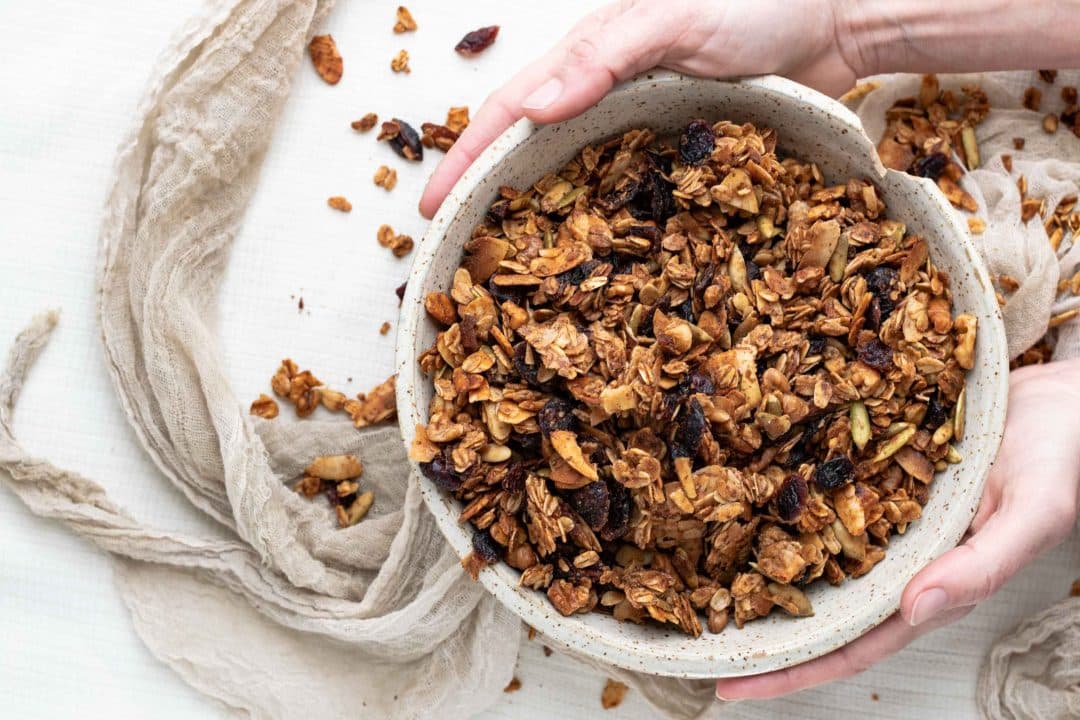 Gif. Honey and maple syrup are two of the best sweeteners you can use for granola because their liquid state coats each oat well. Granola sweetened with pure maple syrup and honey and mixed with dried blueberries is the perfect snack for your friends and family!